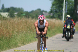 Leon heeft al bijna de eerste van zes rondes gereden als de laatste zwemmer het fietsparcours opkomt. Dat is vijftien kilometer lang en telt vier bochten naar rechts. De steeds warmer wordende zon maakt de wind wakker uit haar slaap, windmolens draaien langzaam hun wieken. Jaimy Voogt rijdt in tweede positie, heeft een minuut goedgemaakt, Leo de Bruijn probeert aan te haken. Tim Wolvetang schuift zienderogen op, roept tot mijn verbazing dat het niet gaat. ‘Je rijdt als snelste rond!’ schreeuw ik hem toe, onwetend van de pijn in zijn vorig jaar geopereerde been die hem een ronde later uit doet stappen.