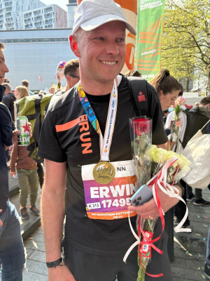 In Rotterdam werden er bloemen uitgedeeld en liep Erwin zijn marathon in 4:22:56. Wat vooral in het teken stond om te genieten, is gelukt. Wat een mooie ervaring. Erwin neemt jullie graag mee in hoe zijn voorbereidingen zijn geweest en wat de dag zelf voor hem heeft gebracht. Bovendien heeft zijn vrouw ruim 10 kilometer gewandeld om hem eindelijk zijn bloemen te kunnen overhandigen. Ze wilde natuurlijk zeker weten dat hij overal langs was gekomen!