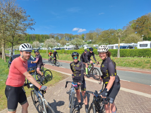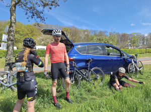 Zaterdagochtend vroeg om 6:15 uur werd bij de Parkeerplaats Sibbe nog even wat gesleuteld aan fietsen en getwijfeld over de kledingkeuze. Het was slechts 6 graden en later in de middag zou het 16 graden worden! Gelukkig hadden we onze eigen volgauto met Louis, aan wie we onze reservekleding, tonnen sportvoeding, bananen, ladingen sportrepen, pasta (!) en een jerrycan water mee konden geven.